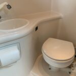 Separate heads compartment has Jabsco manual sea toilet (new 2018), hand basin and shower along with overhead storage.