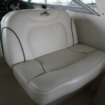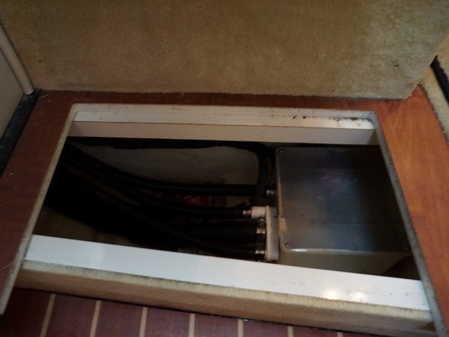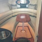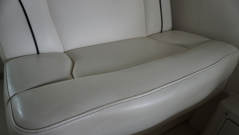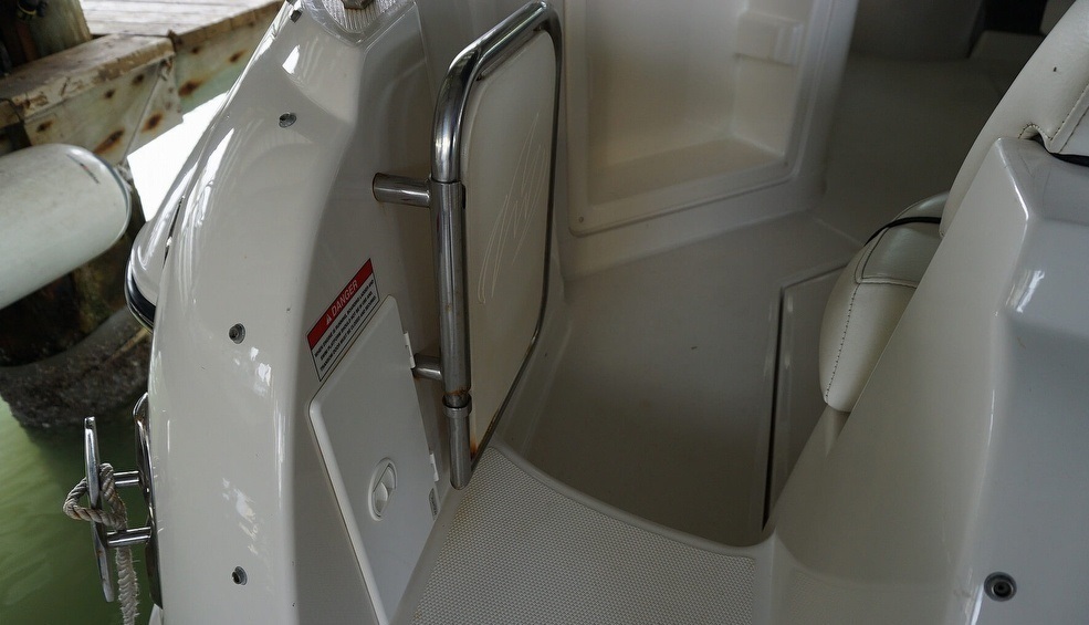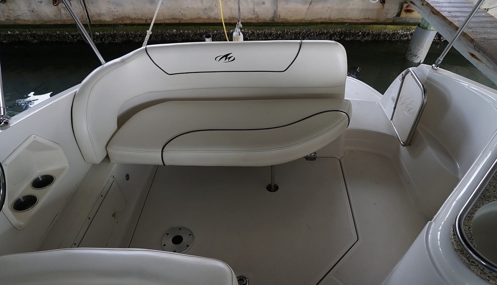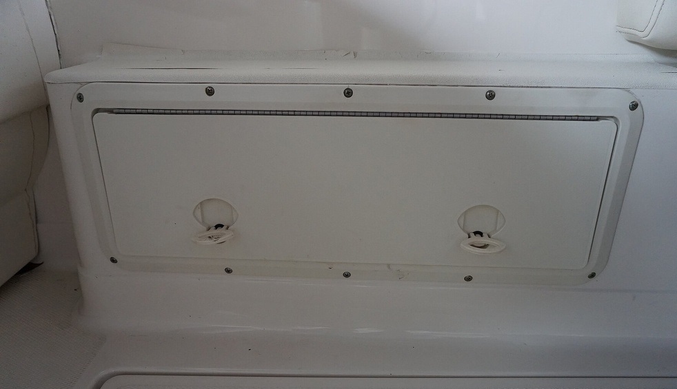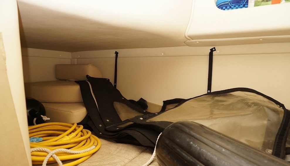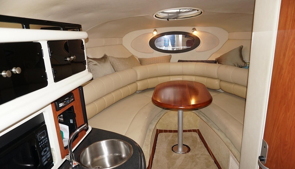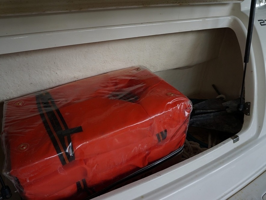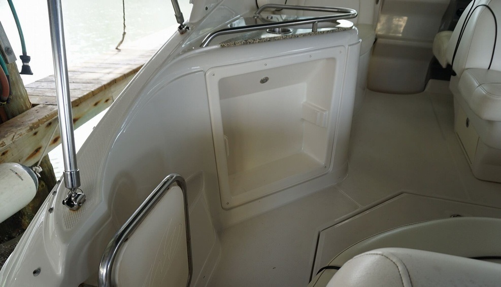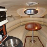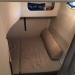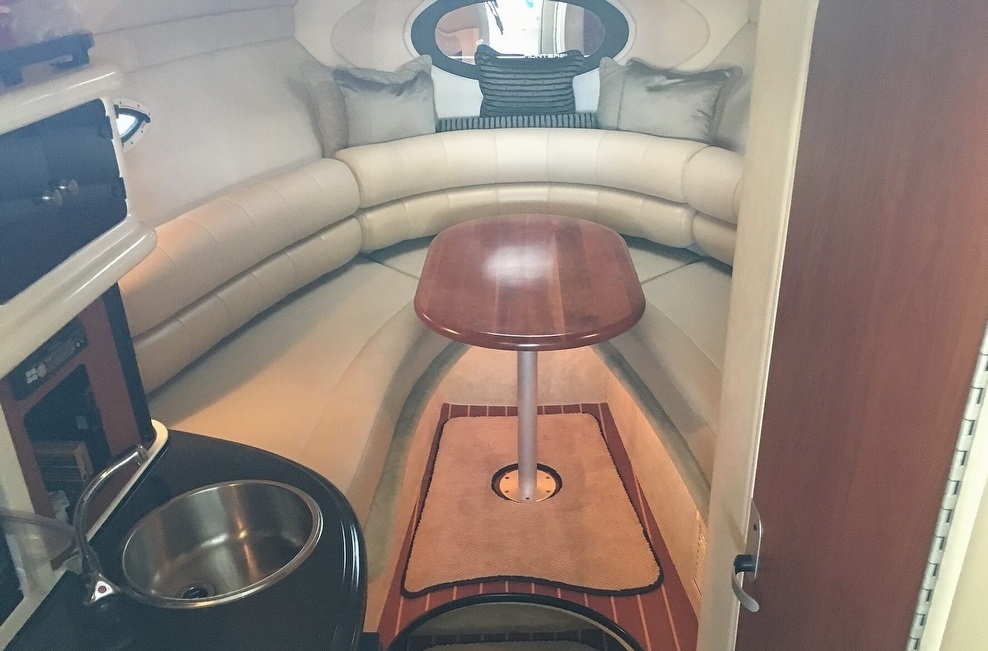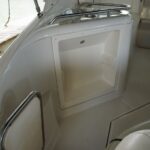 The cockpit has helm seats with space for two people to sit, large chez Lange port side seating, and aft seating area. Icebox, sink and tap to port.