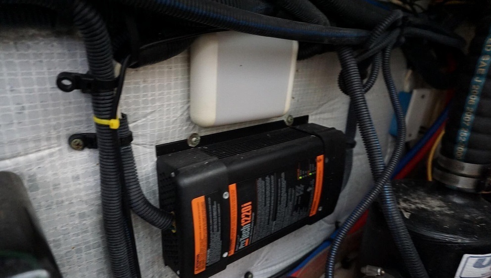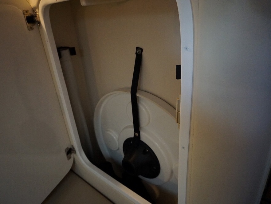 Separate heads compartment has Jabsco manual sea toilet (new 2018), hand basin and shower along with overhead storage.